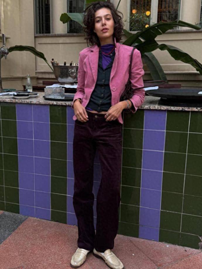她的春日穿搭,是一场色彩的狂欢,也是复古美学的现代演绎。在她的造型里,你能看到粉色灯芯绒西装与深紫内搭的大胆撞色,酒红色皮衣搭配粉色半裙的复古碰撞,还有金色小香风开衫叠穿黑裙牛仔裤的层次巧思,每一种色彩搭配都跳脱了春日穿搭的固有框架,却又和谐得恰到好处。她从不畏惧高饱和色彩,反而用色彩点亮整个造型,让春日的沉闷一扫而空,同时又融入了灯芯绒、麂皮、皮革等复古面料,把 70、80 年代的复古风情,用现代的剪裁和搭配方式重新演绎,打造出独属于自己的复古松弛感,让每一套穿搭都充满故事感,仿佛从老电影里走出来的时髦女郎。